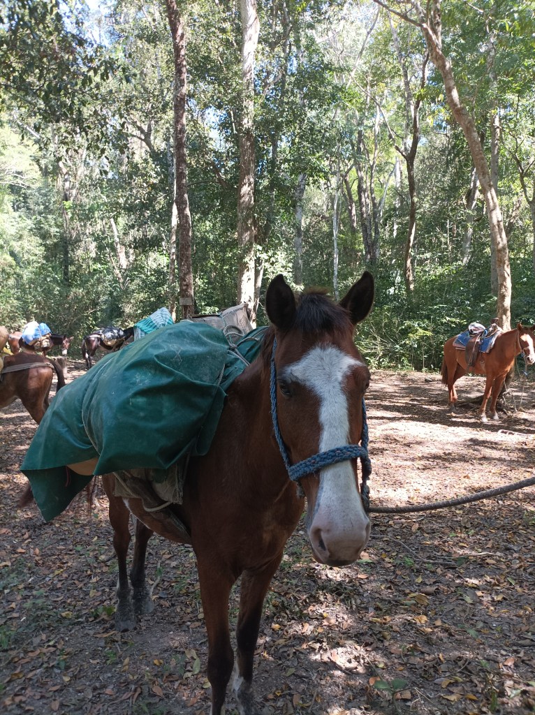 the mules are prepared for the hike in carmelita everything was prepared for the adventure. mules to help carrying food and supplies, a guide and a cook who are both part of antonios family. we had a lovely breakfast and started into the jungle.