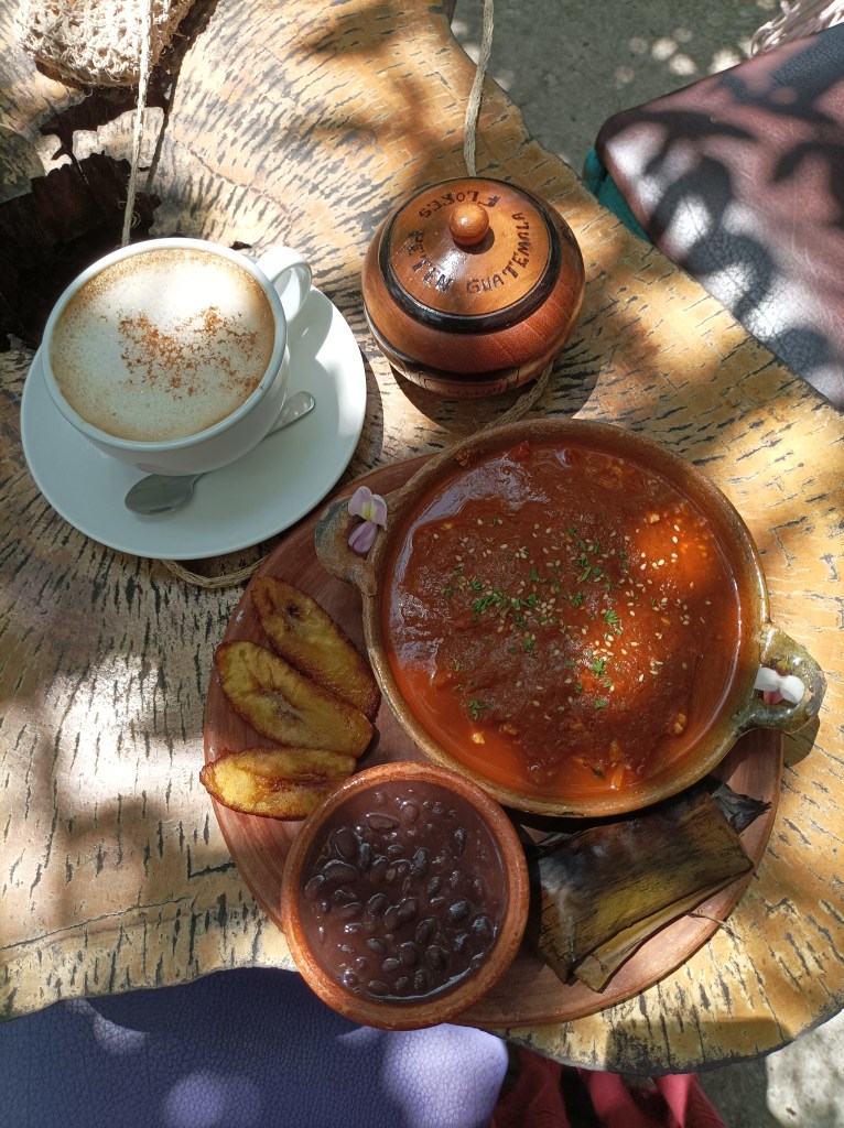 coffee and breakfast in maracuya: shakshuka de pepian with platano, frijoles and a tiny tamale
