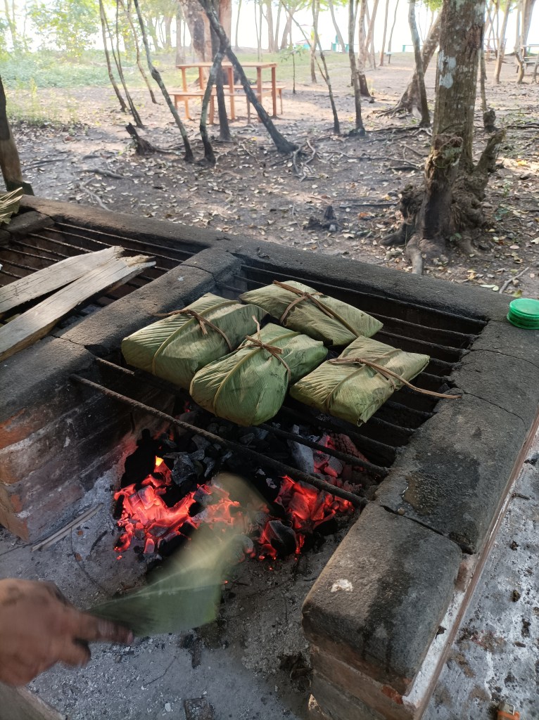 instead of fish I got a wrapped leaf with eggplant, yucca, tomato and onion and a lot of delicious herbs, spices and a powder of pumpkin seeds. the fire had added to the taste and cooked everything to perfection.